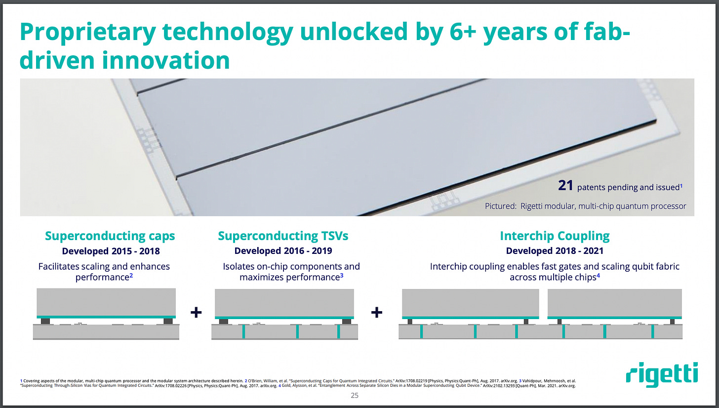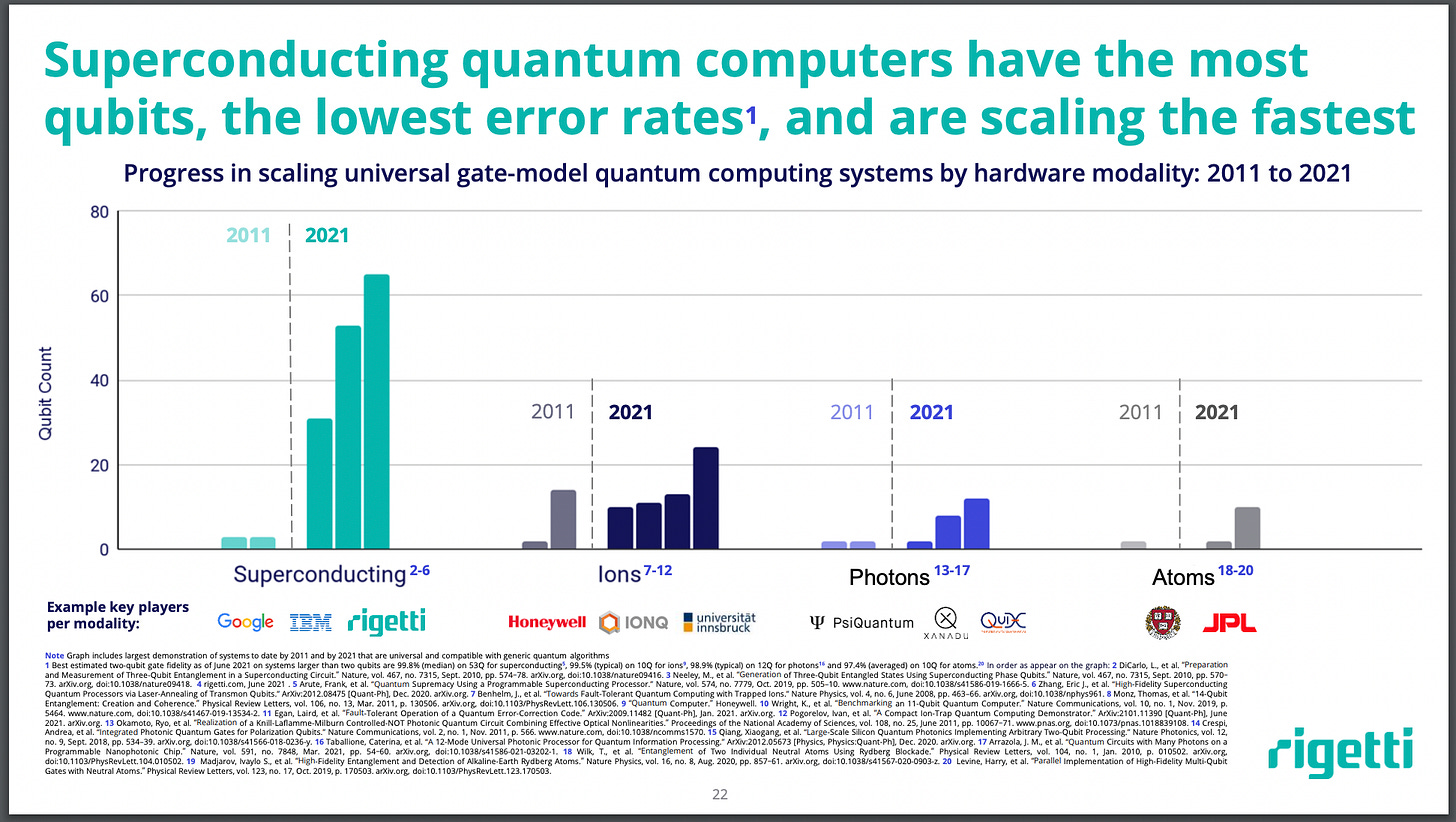 The footnotes are the interesting part here. What this slide does is ride on the success of other superconducting QC teams and suggest that this should make you feel good about Rigetti. In fact, if you read the footnotes, you’ll see that the reason you can make the claim that SC qubits have the best error rates is because Google has 99.8% 2-qubit gate fidelity, beating IonQ by about 0.3%.
