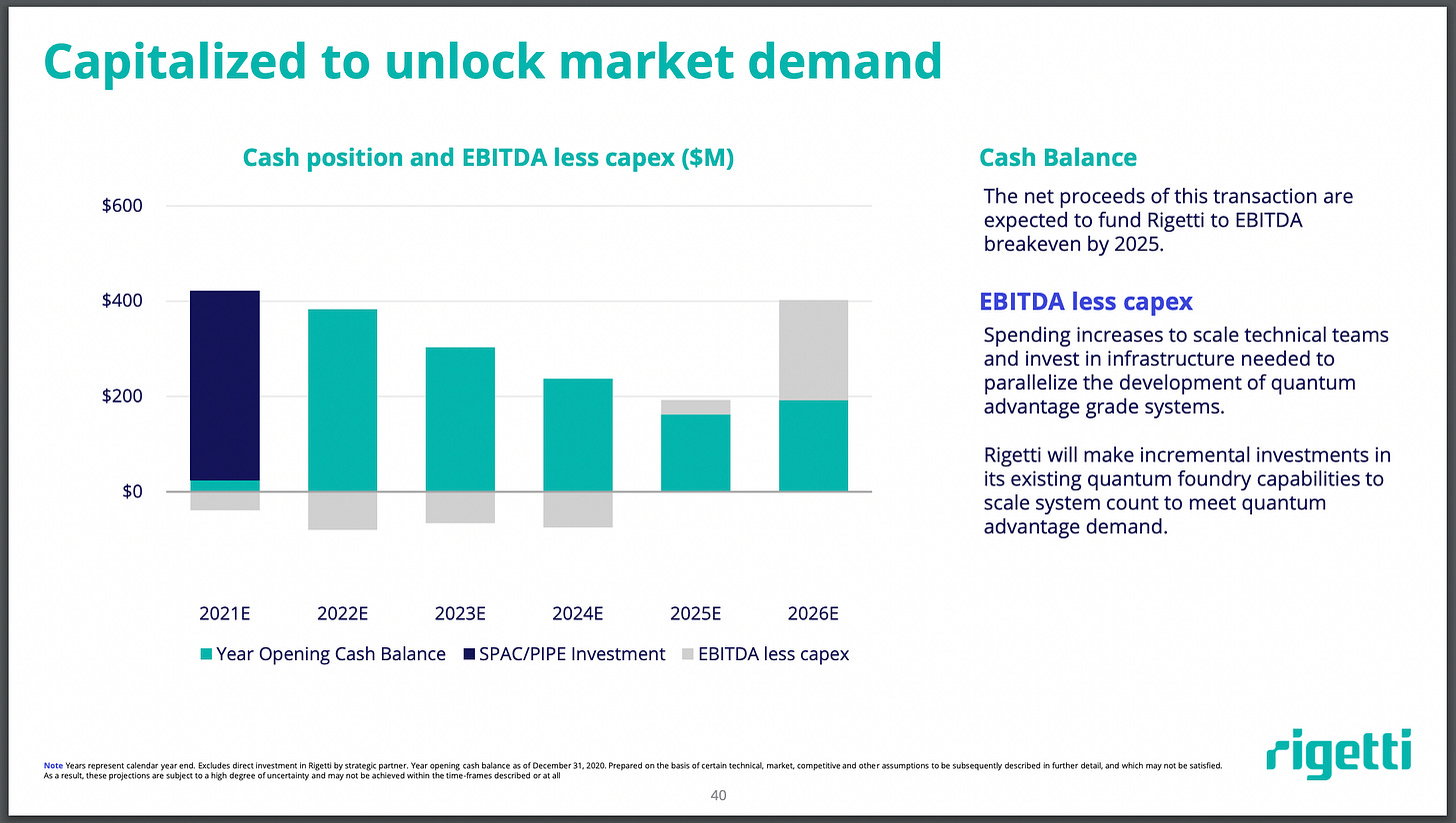 Just eyeballing this chart it seems like Rigetti will have maybe 1-2 years beyond 2025 if they miss these projections and keep spending. After that, I guess they issue more shares or get a loan or something (or implode, but optimism is the theme here).