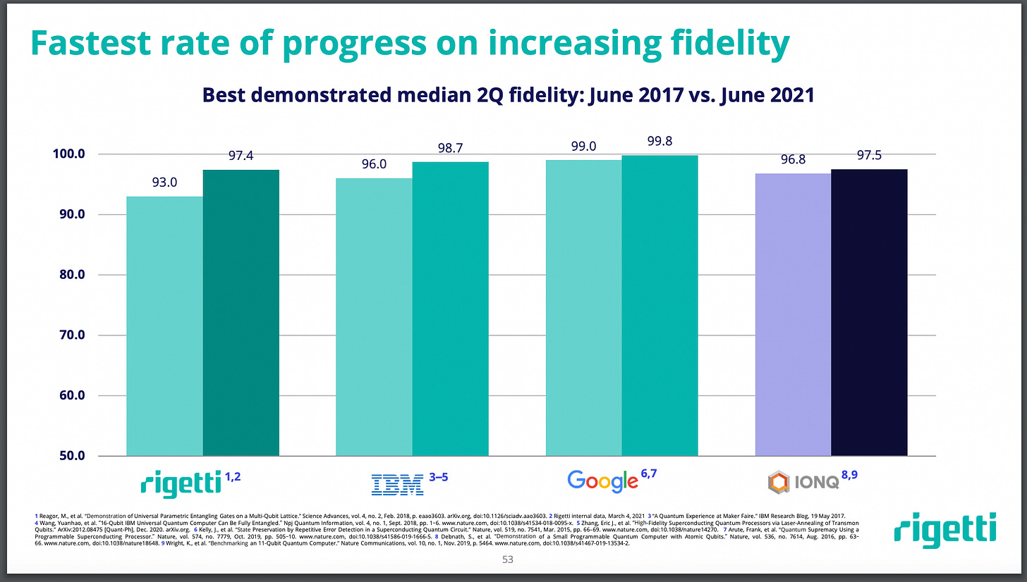 It’s clear here that Rigetti is actually lagging in 3rd behind Google and IBM in terms of rate of improvement in 2Q gate error reduction.