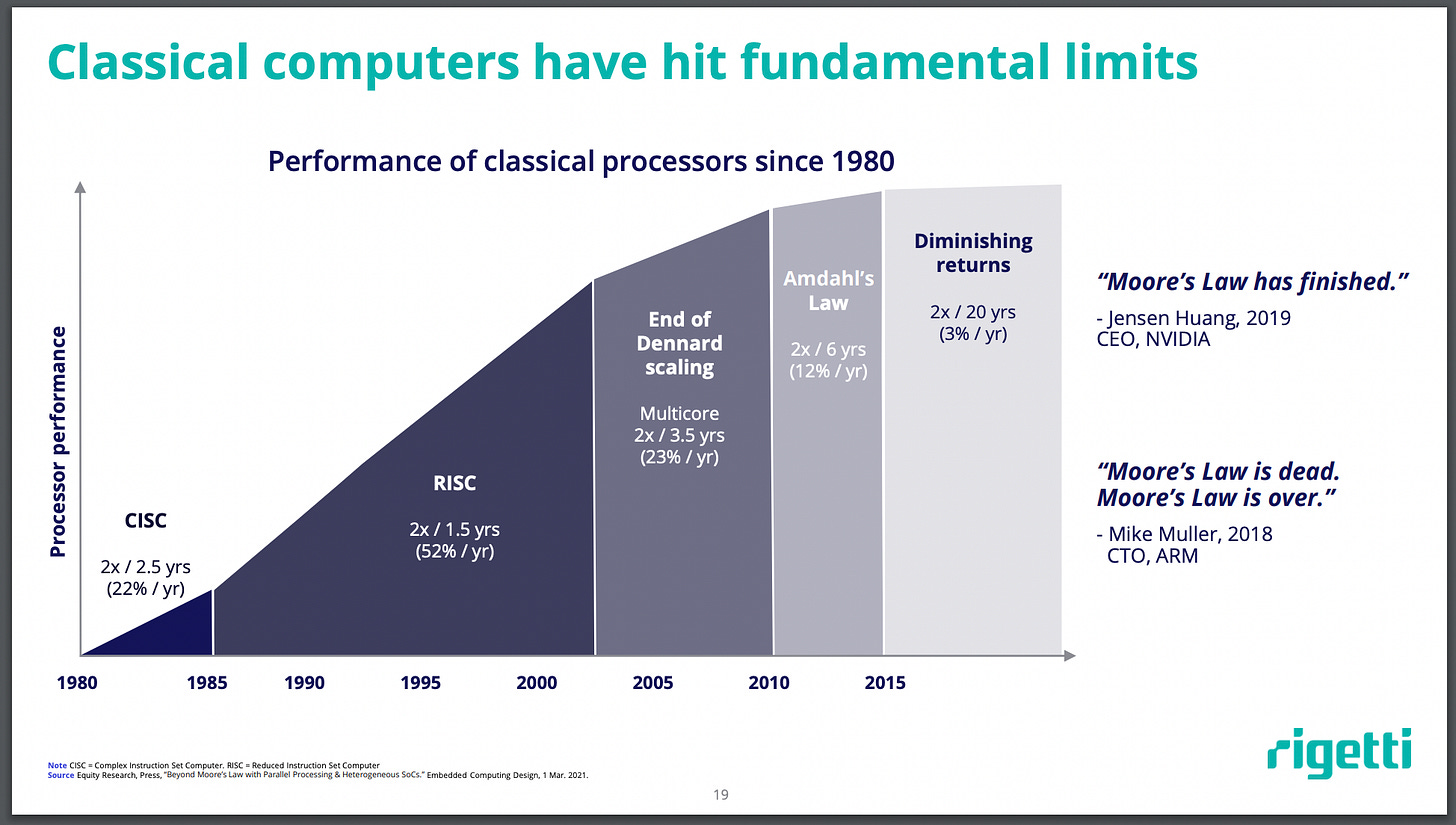 The implication here is that quantum computing will be categorically better than classical. This is, of course, false. Quantum computing will be better for some use cases than classical computing. For all else we will enjoy some Diminishing Returns (or Reversible Computing).
