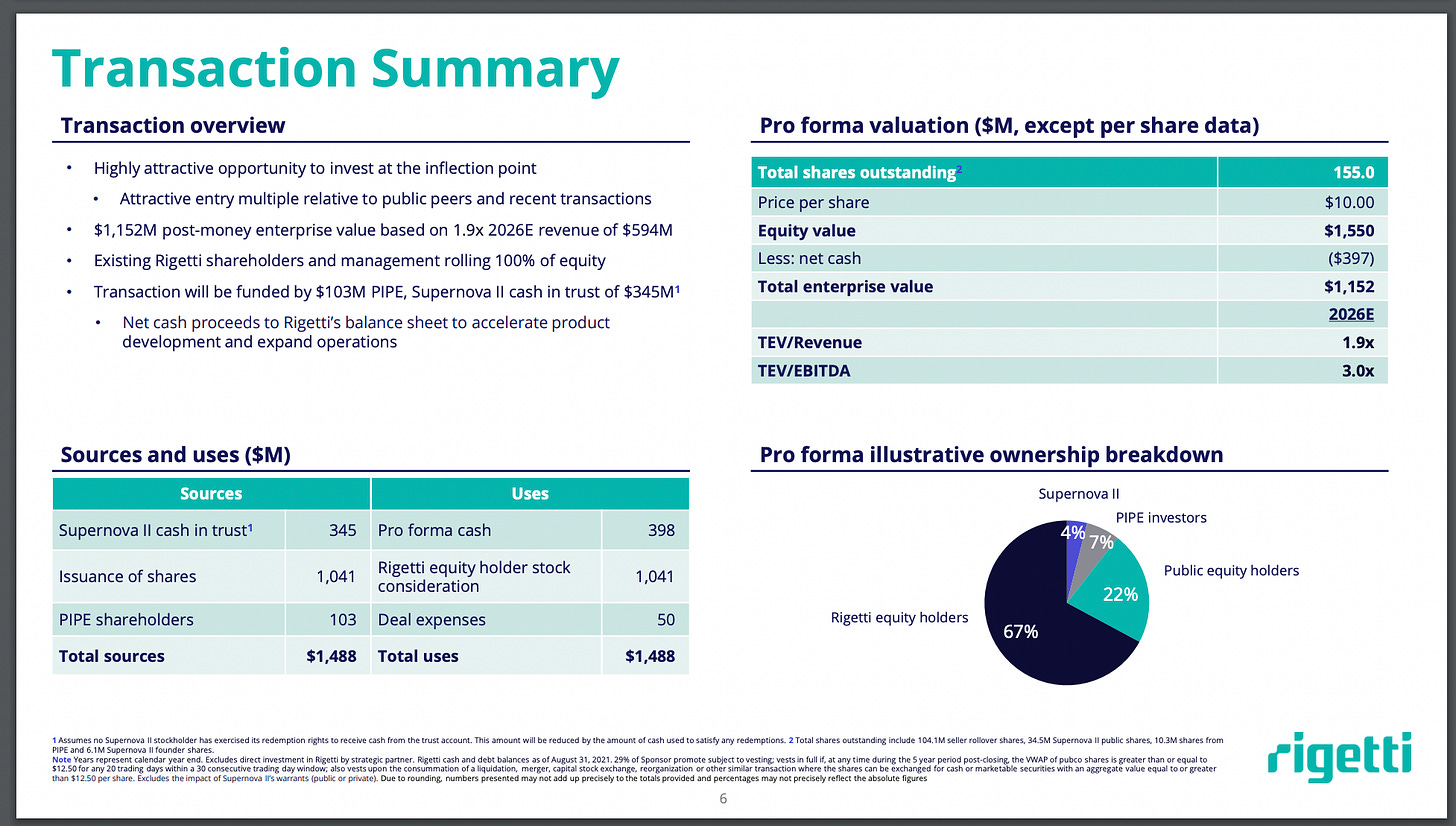 First the transaction at a glance: it looks like Rigetti will be valued at $1.5B. This seems a little odd to me. IonQ was valued at ~$2B, but Rigetti has built their own cleanroom and fab to make their own chips, have more people, and I think dilution refrigerators cost more than the ion-trap UHV + lasers setup, but not too sure on the last point. Lasers can get pretty expensive, and ultra-high vacuum is not exactly easy to get. In short, I expected this valuation to be closer to, or above that of IonQ.