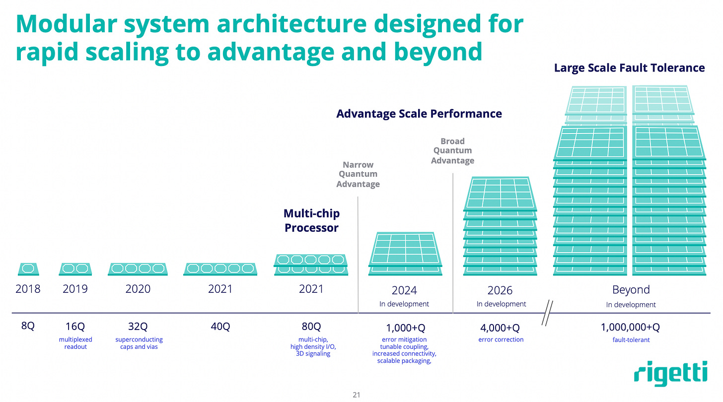 And as you can see above, the Rigetti roadmap is extremely aggressive. 1000 qubits by 2024, 4000+ by 2026. Additionally, we have some clues about what the design and test teams have to have cracked by 2025: error mitigation, tunable coupling, increased connectivity, scalable packaging. Also at the same time, the number of qubits must increase by > 10x. Oh yeah, and Rigetti has partnerships and cloud-accessible QPUs to maintain, so does that mean some amount of their 14 systems6 are simply unavailable to the R&D effort?