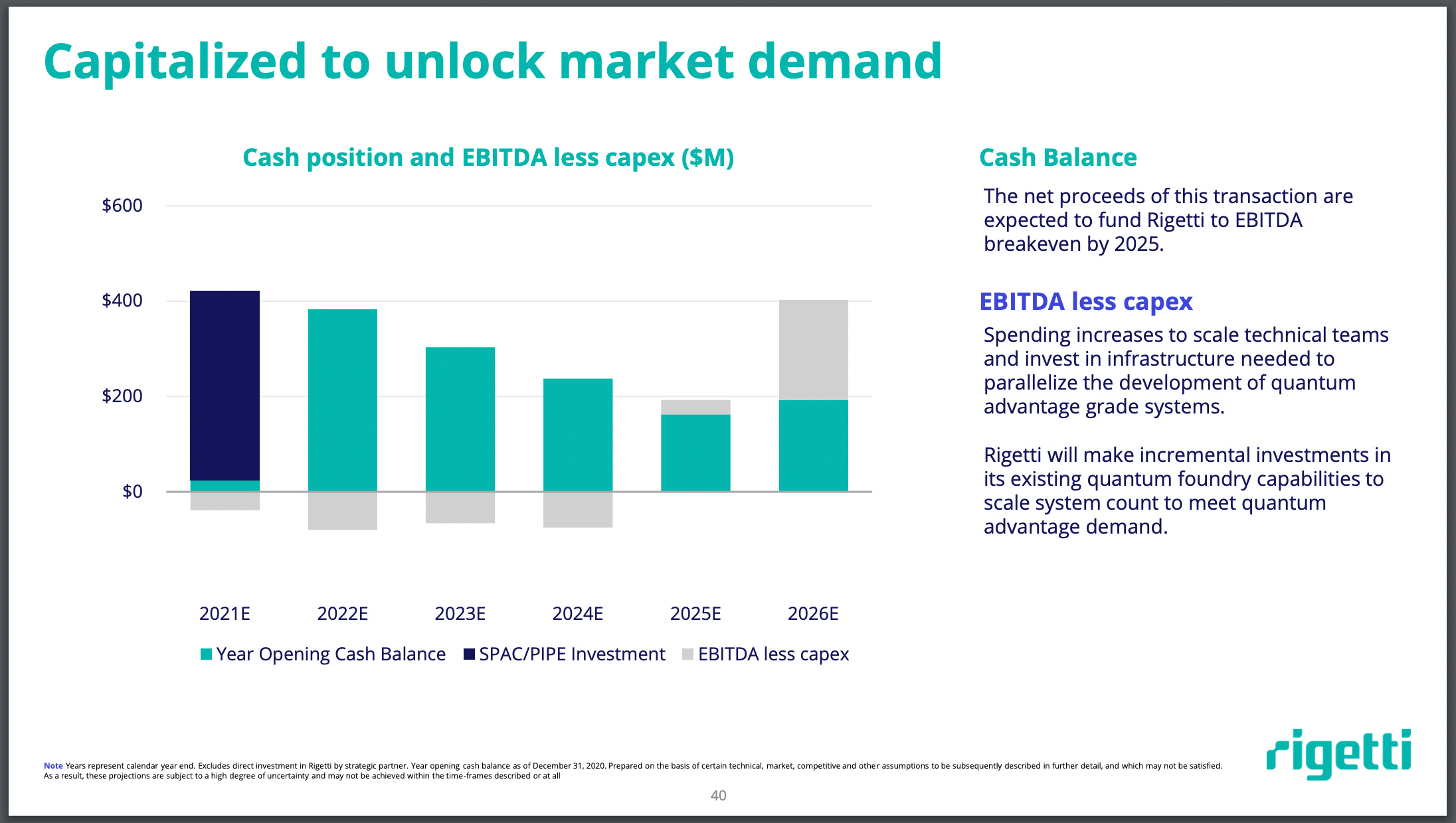 Based on this optimistic view, Rigetti expects to hit breakeven by the end of 2025, and positive cash flow by 2026, roughly 4-5 years from now. Additionally, they expect to spend something like $200-$300 million in pursuit of this goal. With the full SPAC funding, that would leave them with a cushion of about $175 million in cash at the end of 2025.